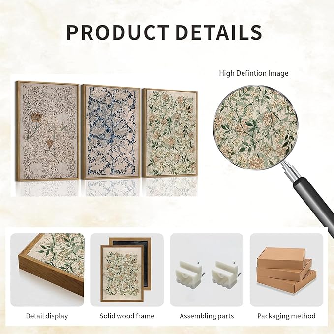 - 【Ready to Hang】These William Morris framed wall art pre-attached sawtooth hangers and lightweight construction ensure easy mounting. Unpack, position, and hang your framed canvas paintings in minutes.