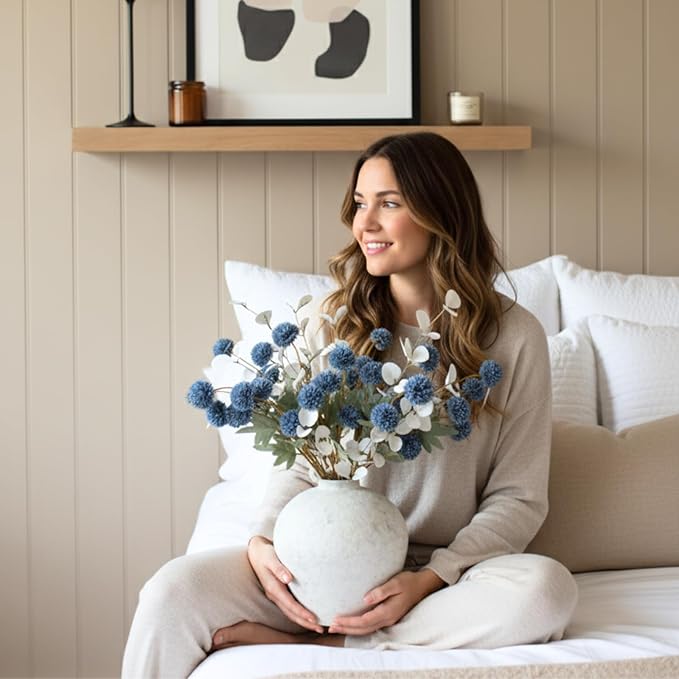 - Blue Artificial Flowers - This set of faux dusty blue flowers which features 2 branches white eucalyptus stems and 10 blue fake mums artificial flowers, creates stunning blue centerpieces for tables. With long stems for vases and perfect for silk flower arrangements, it’s ideal for floral wedding decorations or blue floral decor in living rooms, dining areas, or kitchen.