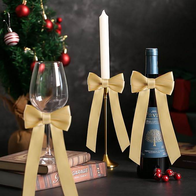 AYGXU 24pcs Christmas Bows Decor,Champagne Gold Bows for Gift Wrapping,Christmas Tree Decorations,Bow Decor,Double-Sided Ribbon Bow,Bag Ties Twists