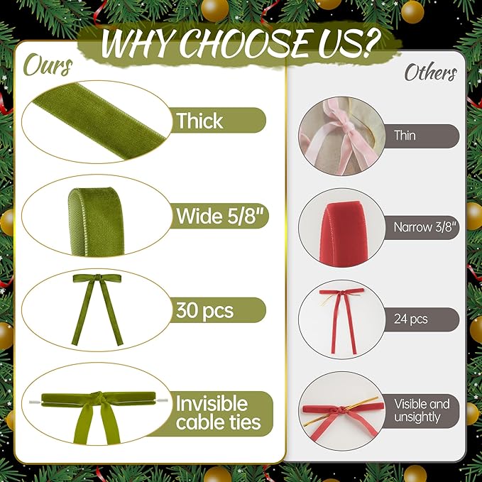 - 🎀Size for Christmas Tree: 30 bows are sufficient to decorate an entire Christmas tree.The velvet texture pairs perfectly with Christmas tree.They can also be tied to Christmas stockings, Christmas wreaths, or used as fireplace decorations.