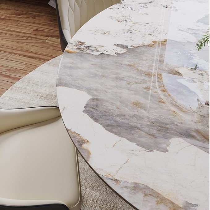 - Sintered Stone Tabletop: Our stone dining table features an advanced, sintered stone tabletop designed to withstand both high temperatures and extreme cold. Its exceptional resistance to oil and stain penetration ensures your table remains fresh and vibrant. Effortless to clean up, even with stubborn stains, this table is designed to meet the highest safety standards maintain longterm use