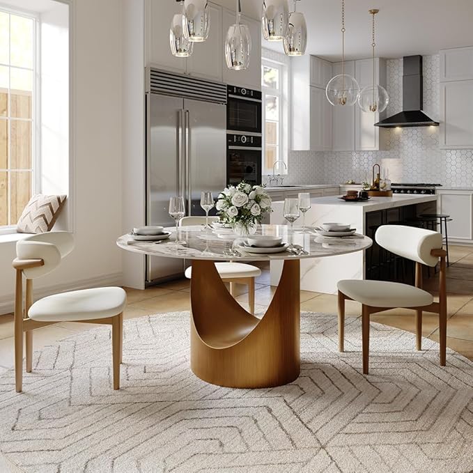 - Smooth Edge Design: The dining tabletop pattern is glossy white marble. Thickness of the tabletop is 12mm, and the edge of the tabletop adopts a humanized smooth edge design to prevent collision, making your family and pets feel more at ease at home. The size of this round dining table is 59 inches, table is recommended for 4-6 people