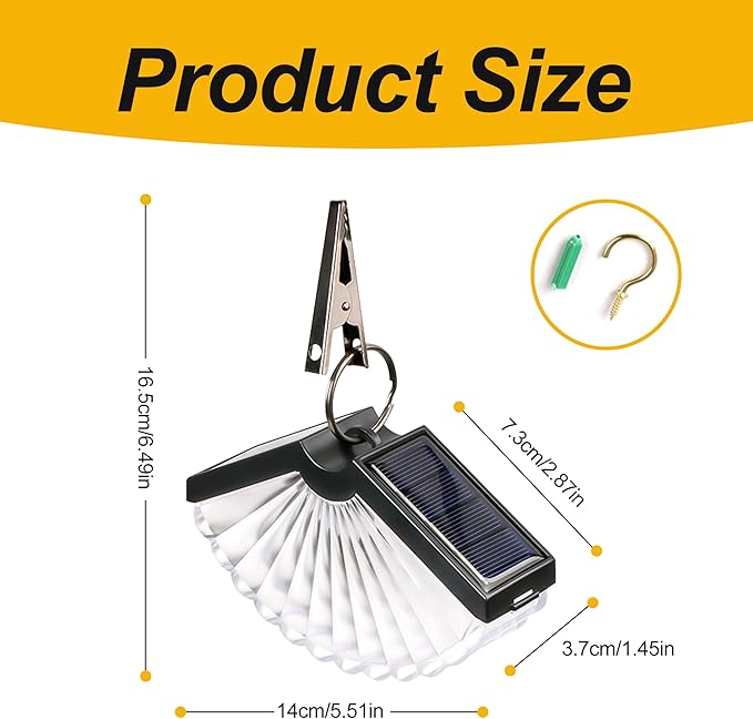 - 【Product highlights】 ✦ Bionic fan shape design: 12-lobed gradient translucent fan, unfolded diameter 14cm, like hibiscus blooming under the moon ✦ Dual solar charging system: high-efficiency monocrystalline silicon plate on both sides of the fan handle, 4 hours of sunshine all night ✦ Second-speed light and shadow mode: warm yellow/three-color gradient, brightness is equivalent to 10 W incandescent lamp ✦ IP65 waterproof body: aluminum alloy skeleton + acrylic fan surface, -20℃ to 50℃ stable operation