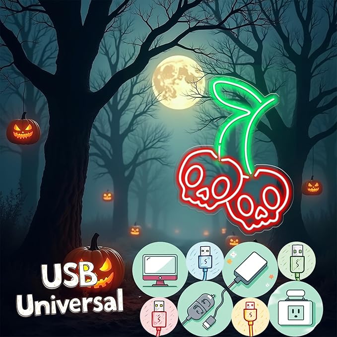 - 【Edgy Cherry Skull Design】:This LED cherry skull neon sign blends gothic vibes with a playful twist, featuring vibrant red "cherry" accents for a striking visual effect.