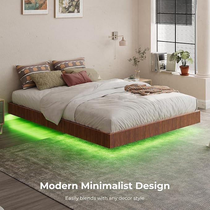 Evermagin Walnut Queen Floating Bed Frame with led Lights, Mid Century Modern Fluted Floating Platform Bed No Headboard, Heavy Duty Metal Float Bedframe No Box Spring Needed