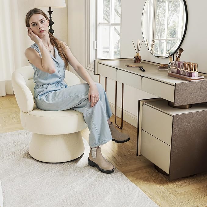 - Ideal for small spaces: This exquisite and compact swivel dining chair features a boucle-shaped design, perfect for compact areas. Versatile and functional, it works as a vanity chair, reading chair, or accent chair, and fits well in bedrooms, balconies, living rooms, dressing rooms, and small apartments