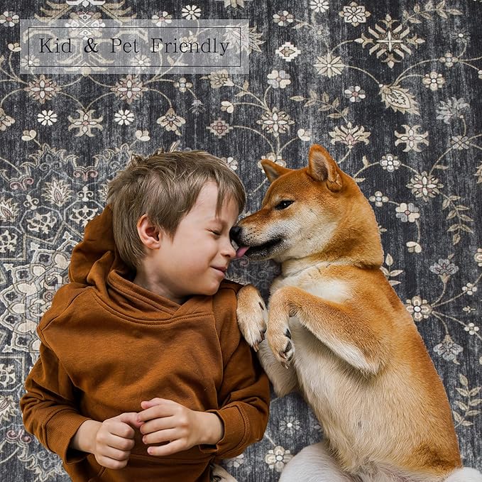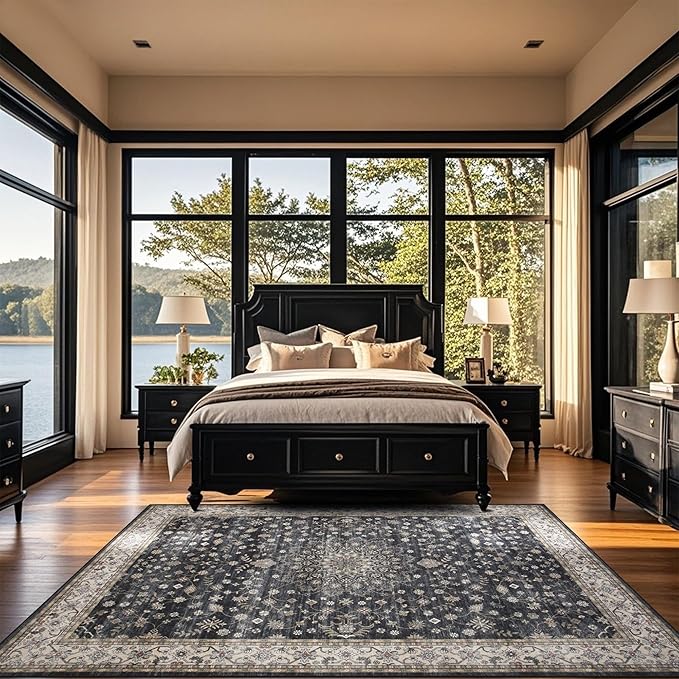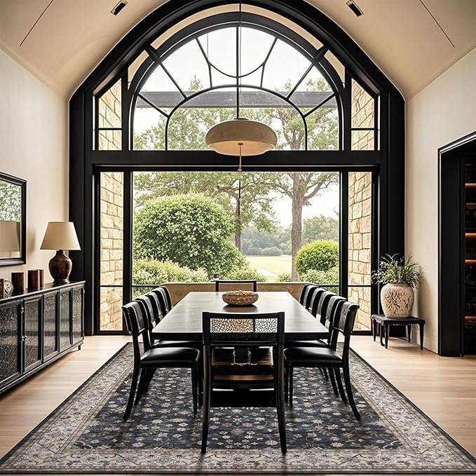 Washable Rugs 8x10 Area Rugs for Living Room,Rugs for Bedroom,Large Carpets,Ultra Soft Faux Wool Retro Dining Room Rug,Non Slip&Non-Shedding Low Pile Vintage Print Rug for Home Office-Black