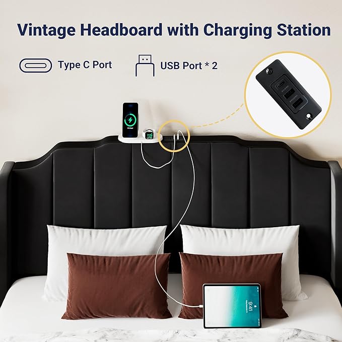 - Convenient Charging Station: This bed frame's headboard features an integrated power strip with 2 USB ports + 1 USB-C port, keeping your devices charged within arm's reach. No more low-battery worries—just effortless power for your phone, tablet, and more