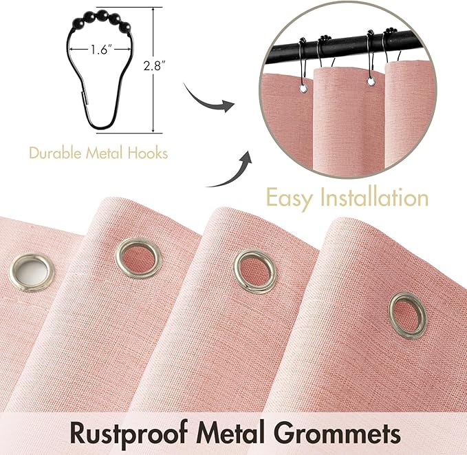 - Package Includes: Comes with 1 faux linen shower curtain featuring reinforced metal holes and 12 bonus metal hooks,rust resistant and easy to slide.You will enjoy the added convenience of these bonus hooks while saving on the cost and effort.