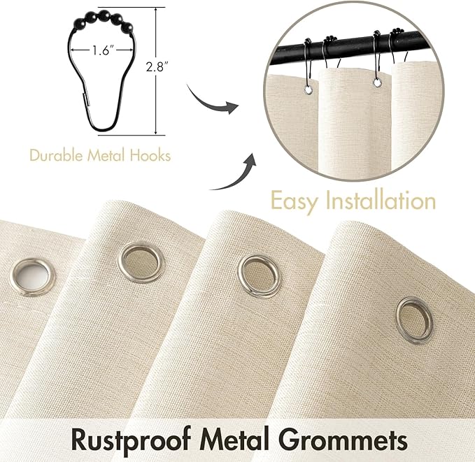 - Package Includes: Comes with 1 faux linen shower curtain featuring reinforced metal holes and 12 bonus metal hooks,rust resistant and easy to slide.You will enjoy the added convenience of these bonus hooks while saving on the cost and effort.