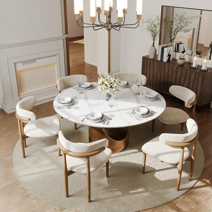 - Round Dining Table: POVISON chic round dining table for 8 is equipped with 12mm matte sintered stone tabletop, also with distinctive smile-like curved metal base design ensures stability, durability, and adds a stylish, modern touch to your dining space
