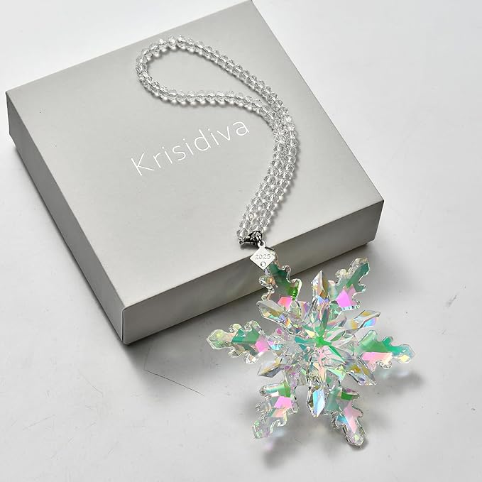 - The product includes: (1) Krisidiva 2025 snowflake jewelry, 2022 version, silver/transparent/color crystal, engraved with labels, gifts for four seasons, size: 4.41 * 3.54 inches, box with Krisidiva logo, ribbon (2), crystal chain (1)
