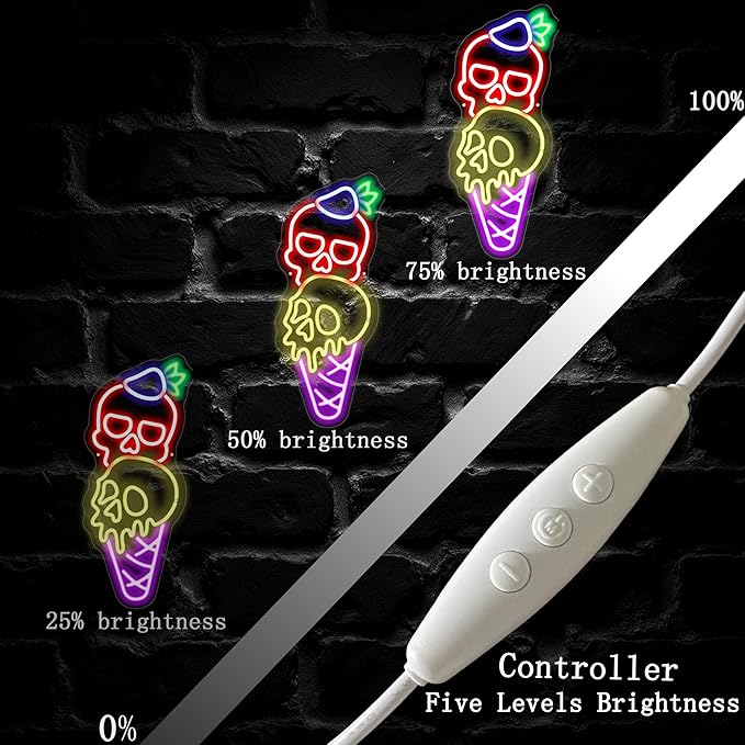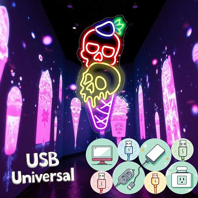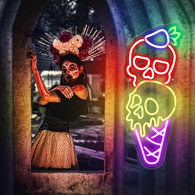 - 【Dark Delicious Glow】: This unique design blends a cheerful ice cream cone with a glowing skull for the perfect mix of cute and creepy. Sweet Meets Dark in a Radiant Glow! Unleash Your Edgy Sweet Tooth! Whether you’re decorating a bedroom, gaming setup, or alternative lounge, this sign delivers a unique vibe that’s both dark and delightful.