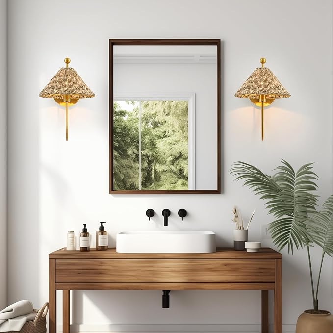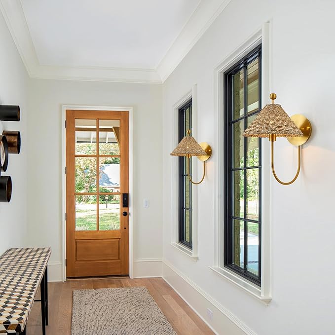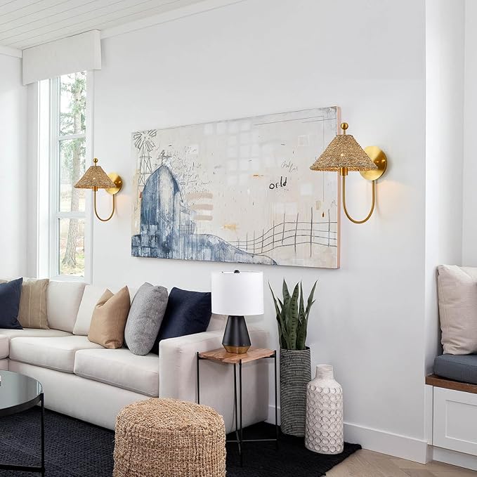 Boho Hand Woven Rattan Wall Scones Set of 2 Brass Wall Lamp Sconces Rustic Wall Lights for Bedside Hallway Vanity Stairway Fireplace Living Room, UL Listed