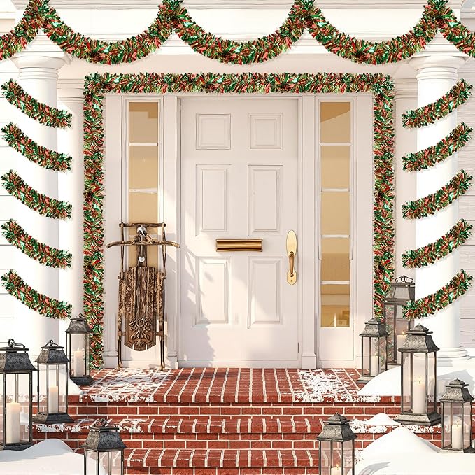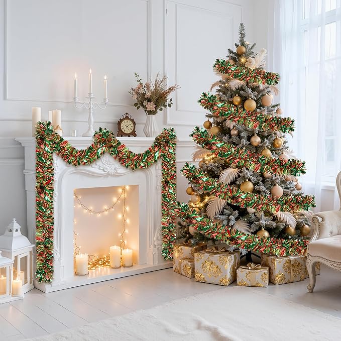- 【VERSATILE DECORATION】 Suitable for both indoor and outdoor use, this Xmas tinsel garland is ideal for decorating Christmas trees, door frames, walls, mantels, fireplaces, window sills, stair railings, and more. Perfect for homes, shopping malls, or corridors, it brings a festive charm to any environment