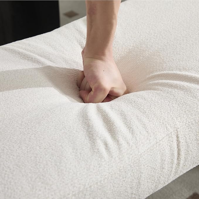 - Modern Sophistication: This trendy accent bench boasts a sleek waterfall design with curved corners and smooth edge. Featuring plush and cozy bouclé upholstery for enhanced softness paired with foam padding for extra comfort