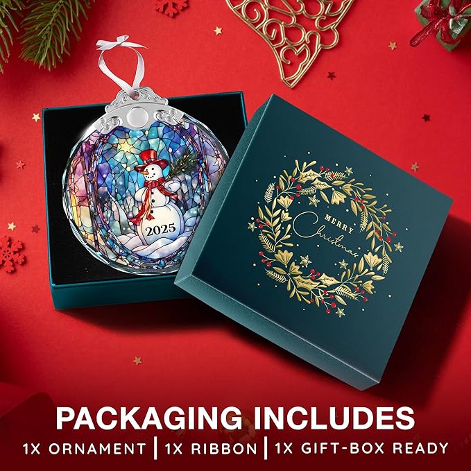 - ELEGANT ORNAMENT SET FOR EVERY TREE - Included is a stunning glass snowman ornament nestled with a festive ribbon in a lovely box. Our set features a round stained glass christmas ornament ready to gift or display. Perfect for anyone collecting christmas snowman ornaments 2025 or enhancing their selection of snowman tree decorations and xmas ornaments.