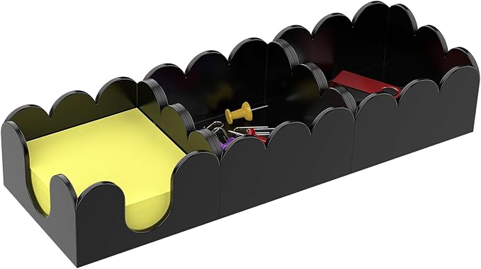 - ăđš Black & Durable AcrylicăA clear view of your important notes. Crafted from quality acrylic material, this black sticky note holder is designed to be shatter-resistant and resist scratches. The subtle scalloped edges provide a modern decorative accent that complements a variety of desktop styles.