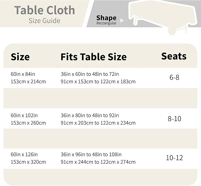 - Perfect Size: The table cloths are 60 x 126 Inch for 6FT rectangular table. This rectangle tablecloth is perfect for protecting and decorating your table.