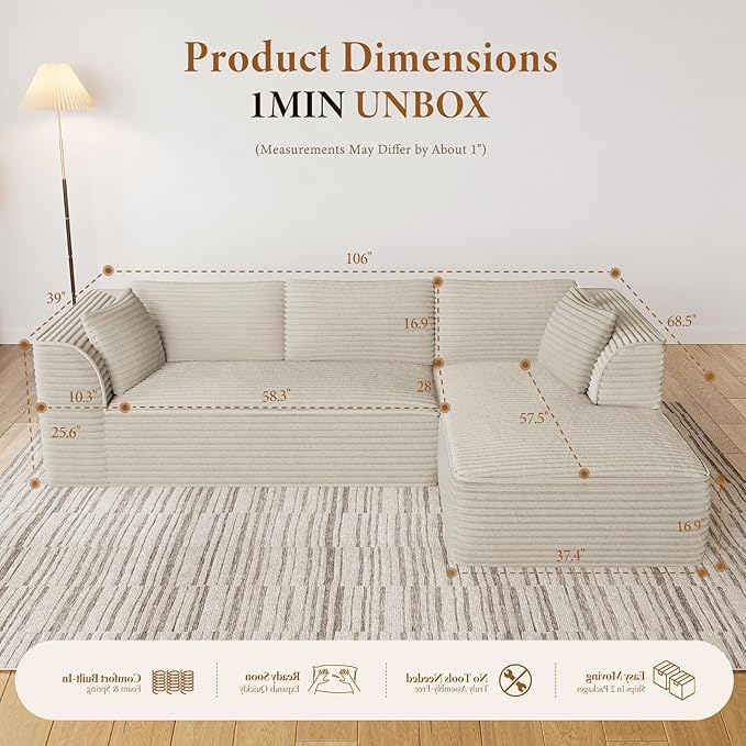 Vesgantti 106" Modular Sectional Sofa with Chaise, Deep Seat Comfy Cloud Couch Corduroy L Shaped Sofa Sectional Couches for Living Room Bedroom, No Assembly Required (Camel, Right-Facing Chaise)