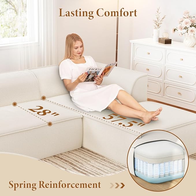- Comfortable Support: Expertly engineered with a high-density foam and spring system that delivers the perfect balance of plush softness and supportive structure—the integrated spring system provides lasting resilience and extended durability, while the memory foam delivers a sensation of cloud-like comfort. Designed for ultimate relaxation, the generous 28" seat depth, elevated back cushion and arcuate armrests create an inviting lounging oasis, while the spacious 58" chaise lounge offers ample room to stretch out. Thoughtfully incorporated ergonomic features ensure ideal support for prolonged sitting or reclining