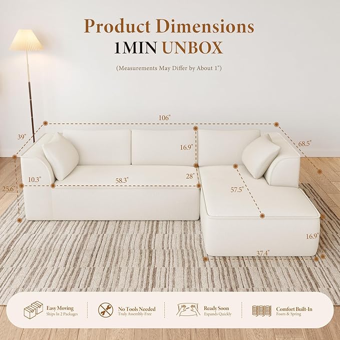 - No Assembly Required: Vesgantti cloud sofa arrives tool-free and vacuum-packed for effortless setup. Simply unbox, allow it to expand for up to 72 hours, and it’s ready to enjoy! Our boneless cloud couch can be placed on either side for customizable comfort—start relaxing from the moment you get it. Note: Minor wrinkles are normal after compression, and cushions may take up to three days to fully regain their fluffiness