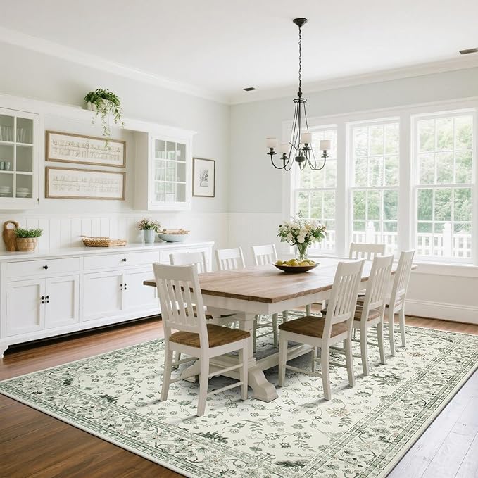Washable Rugs 8x10 Area Rugs for Living Room,Rugs for Bedroom,Large Carpets,Ultra Soft Faux Wool Retro Dining Room Rug,Non Slip&Non-Shedding Low Pile Vintage Print Rug for Home Office-Green