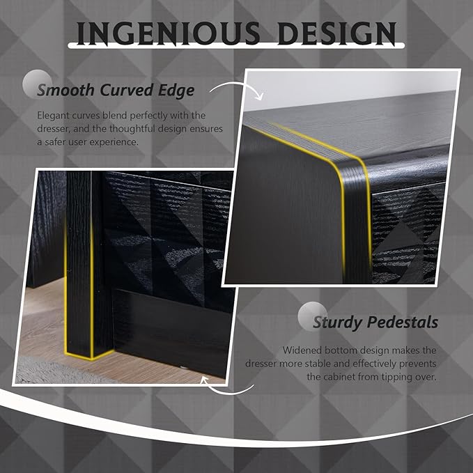 - GEOMETRIC DIAMOND-EMBOSSED DRESSER: Redefining functional elegance through clean geometry, this design pairs diamond-faceted drawers with wood panels joined at precise 45-degree angles, creating striking light-play that elevates visual drama. The modern luxury aesthetic is accentuated by signature metal handles - blending sculptural beauty with everyday practicality