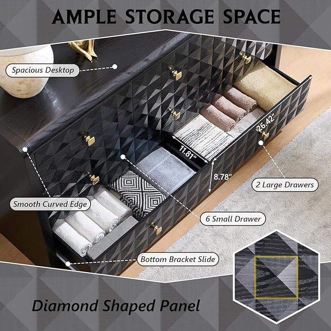 Modern 8 Drawer Dresser for Bedroom, Wooden Large Dressers &Chests of Drawers w/Two Different Drawer Sizes, Mid Century Modern Dresser w/Diamond Panel Decorate for Bedroom, Curved Profile Design,Black