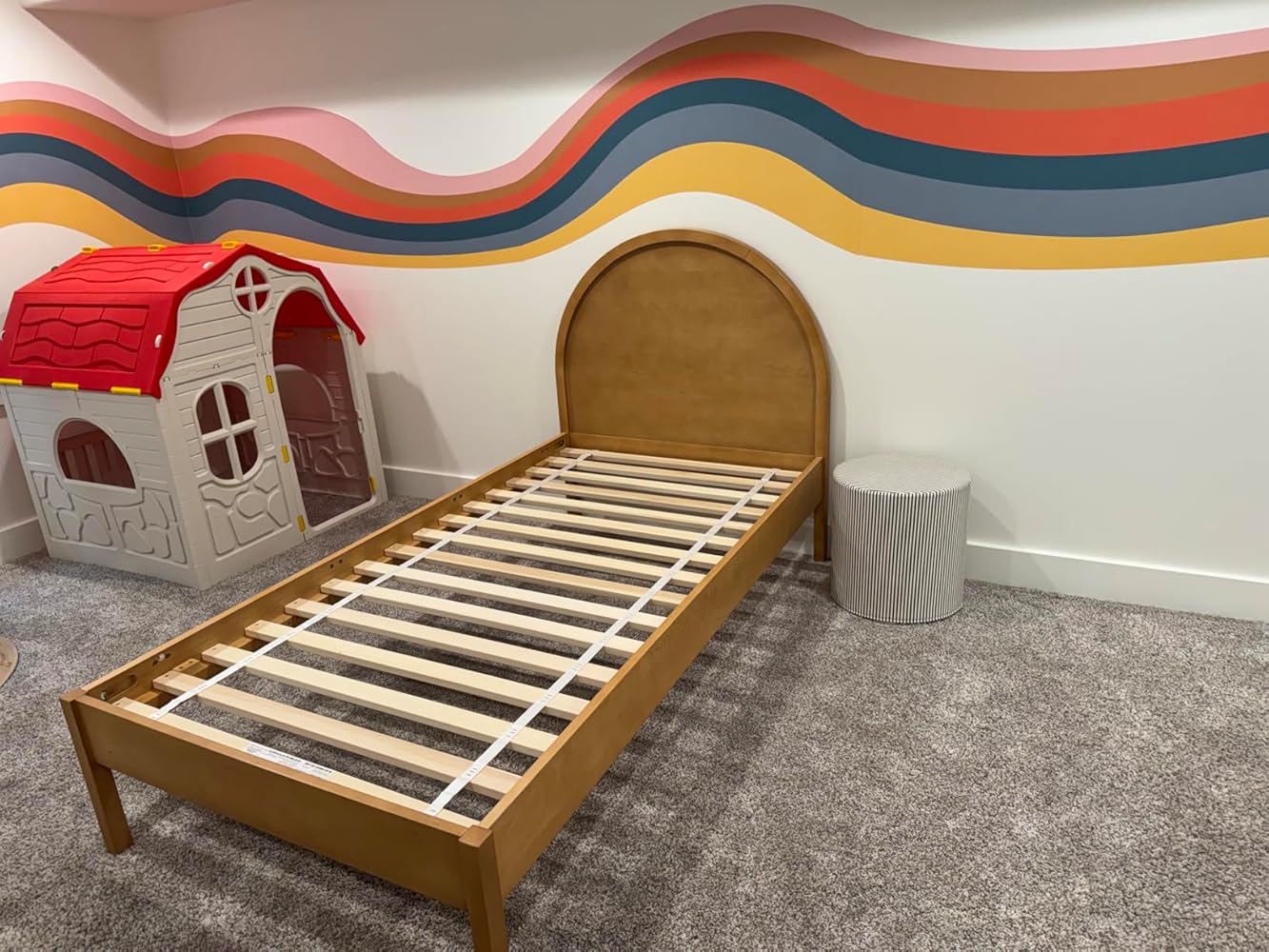 This bed was a perfect addition to my 4 year-old daughter’s bedroom!To begin with, it was easy to put together and took half an hour at max to assemble, just 3 steps!The bed’s honey wood finish looks just like the photos online which I really appreciated. It’s very strong and sturdy. The arched headboard feels a little more grownup which my daughter enjoys. There is plenty of space underneath to store flat boxes or storage bins which is super helpful.I would highly recommend this bed to anyone looking to upgrade from crib to grown up bed, I think we’ll have this a long time!