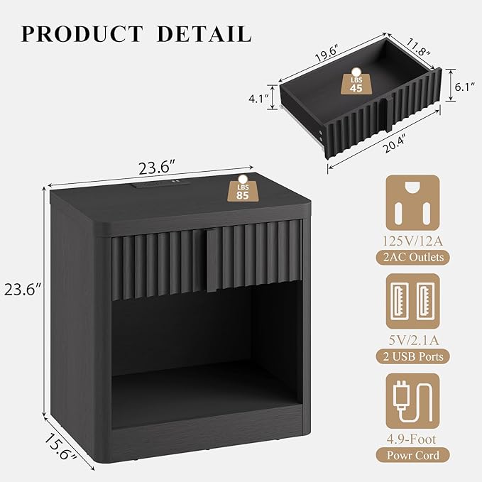 - 【Nightstand with Charging Station】This nightstand with charging station features 2 USB ports and 2 AC outlets for effortless charging. The bedside table with USB ports keeps phones and tablets within reach while reducing cable mess. A rear cable hole neatly hides wires, making your small nightstand look clean, modern, and well-organized every day