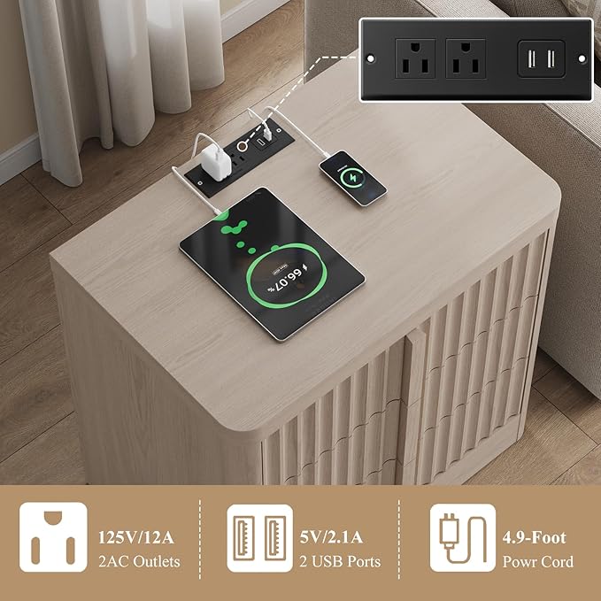 - 【Nightstand with Charging Station】This nightstand with charging station features 2 USB ports and 2 AC outlets for effortless charging. The bedside table with USB ports keeps phones and tablets within reach while reducing cable mess. A rear cable hole neatly hides wires, making your small nightstand look clean, modern, and well-organized every day