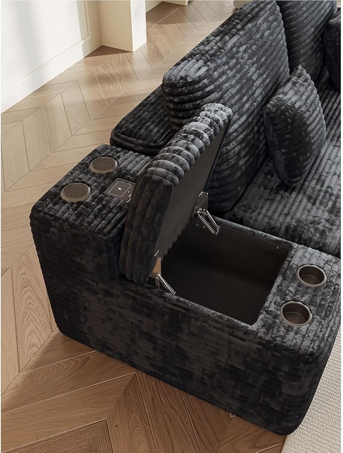 - [Multi-Functional Console with Storage & Charging Features] The 14.56" wide console is removable and can be placed in various locations for flexible display and easy access. It includes a storage box for cushions, magazines, and other household items, as well as wireless charging, 2 USB charging ports, 2 cup holders, and a Bluetooth speaker, offering convenience and functionality.