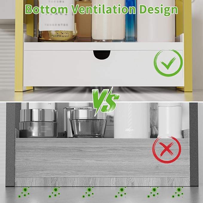 - Sturdy and Durable: This bathroom vanity organizers is made of high-quality wood and solid metal, and the bottom ventilation design can resist the moisture of the bathroom environment. The simple design fits your home style.