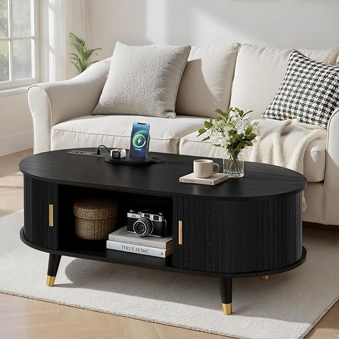 Mid-Century Fluted Oval Coffee Table with 360° Tambour Doors, Hidden Storage, Solid Wood Legs & 2 AC+2 USB Charging Station, Modern Coffee Table for Living Room, Apartment, Black