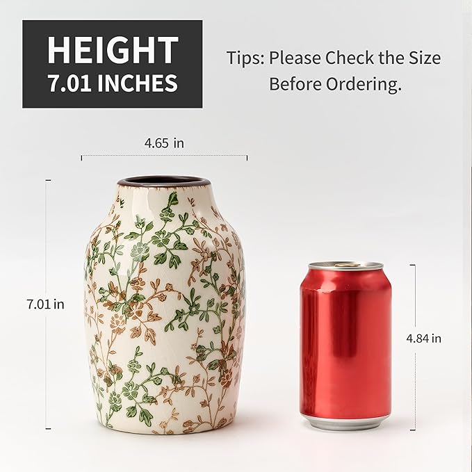 - ๐๐๐๐ฌ๐ฎ๐ซ๐๐ฆ๐๐ง๐ญ๐ฌ: This vintage vase measures 7" height and 4.65" width.Perfect for greenery and dry or faux florals,but also can hold water for fresh flowers. This beige and green vase seamlessly blends with various themes,from vintage home decor to modern farmhouse.Bringing natural beauty to your space.