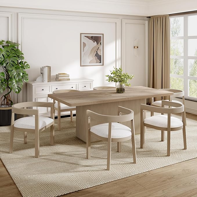 Merax 7-Piece Dining Table Set - 84'' Modern Rubberwood Table & 6 Tub Chairs, Minimalist Open-Back Design for Kitchen Dining Room, Easy Assembly, Beige+Light Natural