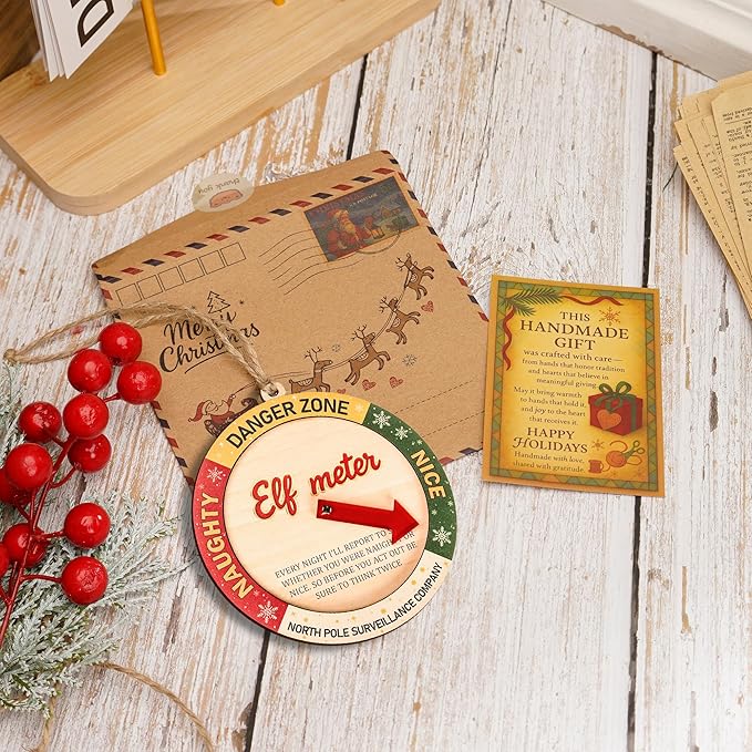- 🎅 Bright, Festive Colors – Cheerful Christmas Tree Display: The vibrant red, green, and yellow color palette is designed to pop against holiday lights and décor, while the natural wood base adds warm, rustic charm. The circular Elf Meter layout with cute Elf graphics and bold typography creates a whimsical, classic Christmas vibe that looks adorable on any tree.