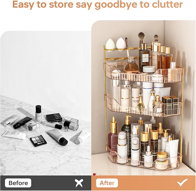 Corner Bathroom Counter Organizer with Makeup Brush Holder & Toothbrush Holders, Makeup Organizer for Vanity Countertop, Acrylic Skincare Storage Shelf (Amber, 3-Tier)