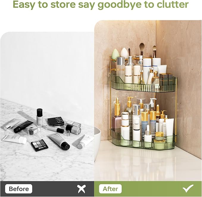 Corner Bathroom Counter Organizer with Makeup Brush Holder & Toothbrush Holders, Makeup Organizer for Vanity Countertop, Acrylic Skincare Storage Shelf (Green, 2-Tier)