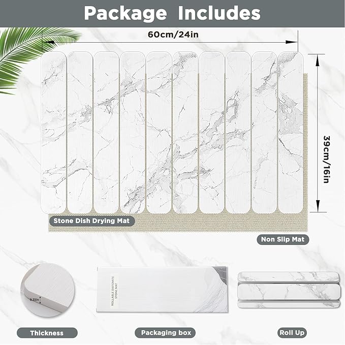- 【Super Absorbent & Fast Drying Stone Mat】Crafted from natural diatomaceous earth and reinforced with durable PVC, our stone drying mat instantly absorbs water like magic! Its microporous structure accelerates evaporation, leaving your countertops flawlessly dry and spotless. No more puddles or stains—just a sleek, sustainable solution for your daily routine.