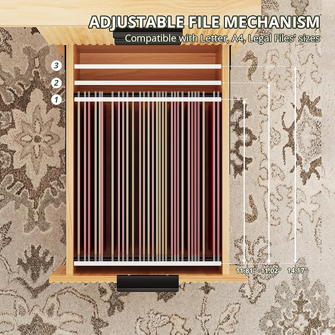- Desk with File Cabinet: The home office desk designed modular drawer system includes three different drawer sizes. The bottom file drawer comes with two adjustable metal hanging bars, allowing you to store Letter, Legal, and A4 folders with ease. These storage drawers are perfect for organizing office supplies, important documents, and daily essentials.