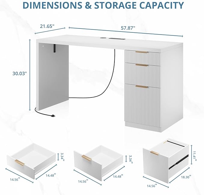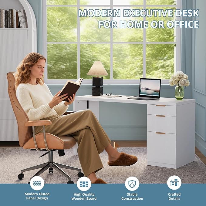 FURSUN 58" Modern Executive Desk with Storage, Home Office Desk with Drawer & Cabinet, Wooden Fluted Desk for Study, Living Room, Bedroom, White