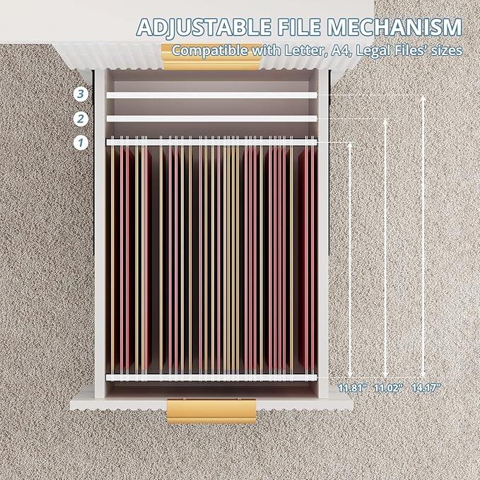 - Desk with File Cabinet: The home office desk designed modular drawer system includes three different drawer sizes. The bottom file drawer comes with two adjustable metal hanging bars, allowing you to store Letter, Legal, and A4 folders with ease. These storage drawers are perfect for organizing office supplies, important documents, and daily essentials.