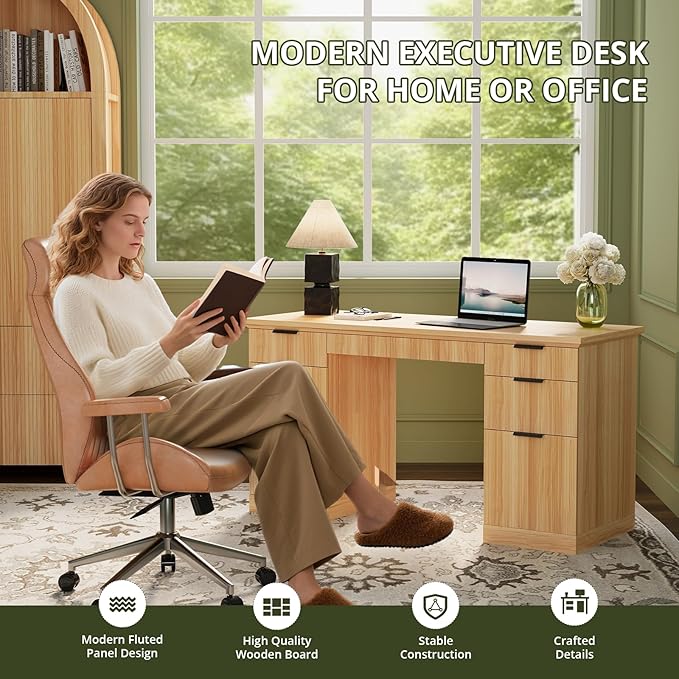 FURSUN 58" Fluted Modern Desk with Storage, Home Office Desk with 1 File Cabinet & 5 Drawers, Wood Executive Computer Writing Desk for Study, Living Room, Bedroom, Natural Oak