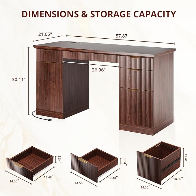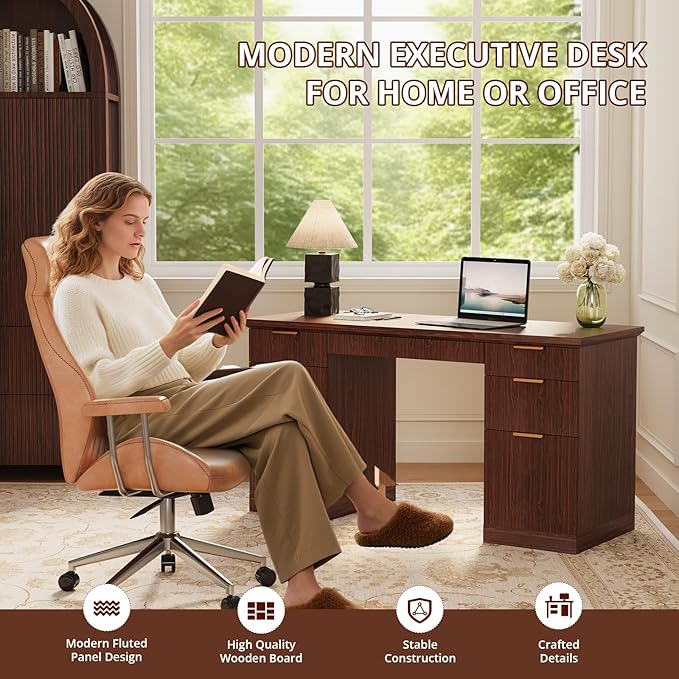 FURSUN 58" Fluted Modern Desk with Storage, Home Office Desk with 1 File Cabinet & 5 Drawers, Wood Executive Computer Writing Desk for Study, Living Room, Bedroom, Dark Walnut