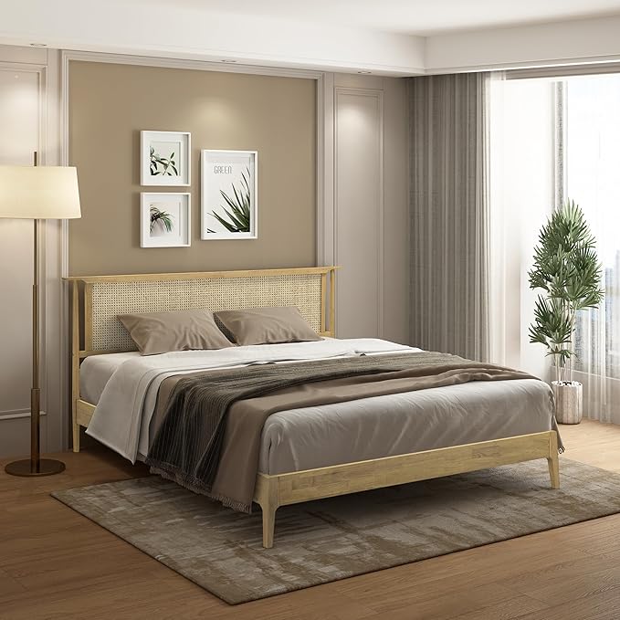Elevate your bedroom with the NTC Ruby Wooden Bed Frame. Crafted from solid oak and rubber wood, featuring a natural rattan headboard and silent slats for strength, style, and serenity.