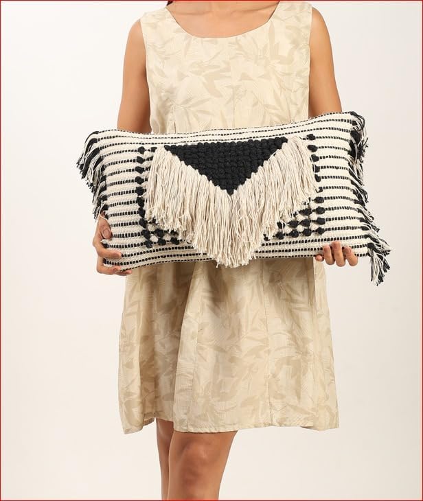 Decorative Boho-Chic Pillow Cover Handwoven Tufted Cotton Accent Pillows, Neutral Throw Cushion for Couch or Bed, Farmhouse & Bohemian Home Decor, Trendy USA Design (Black Lumbar 12x20)