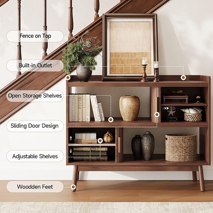 - SIDEBOARD CABINET WITH BUILT-IN OUTLET: This sideboard cabinet boasts mid-century modern aesthetics, making it a showstopping accent piece for any room. The fence on top adds visual allure, and the built-in charging station keeps devices powered and organized with ease. Featuring silky-smooth sliding doors and compact yet spacious storage, this innovative cabinet seamlessly blends vintage charm with contemporary convenience