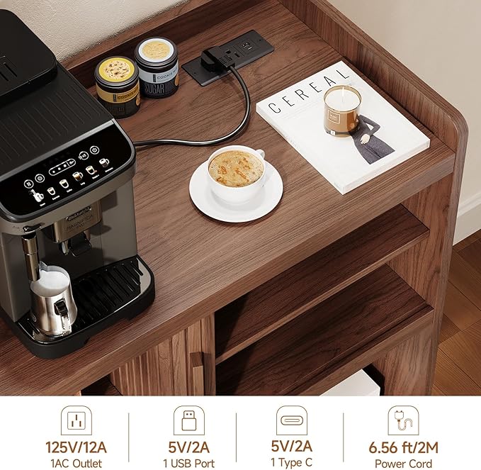 ONBRILL 44" Sideboard Buffet Cabinet with Outlet & 2 Open Storage Spaces, Fluted Sideboard Cabinet with Sliding Door & Adjustable Shelves, Mid-Century Accent Coffee Bar Console Table with Wooden Feet